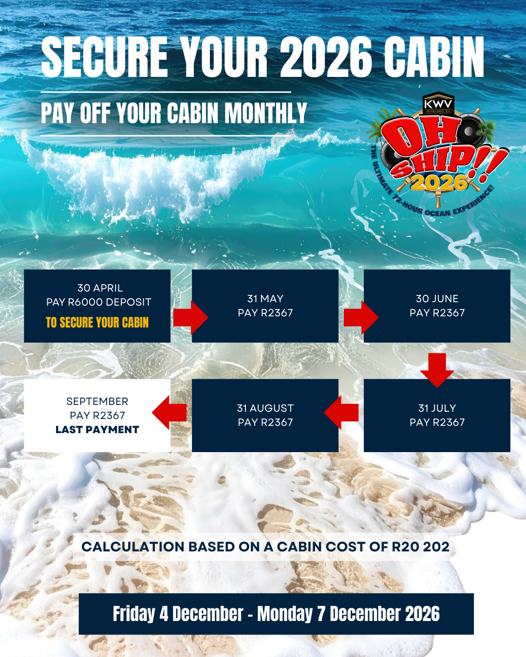Ease your way onto Oh Ship 2026! Secure your cabin with our flexible payment plan. Pay off any amount monthly in manageable instalments, ensuring you have no hefty payments at the end. Create your customised payment plan today!